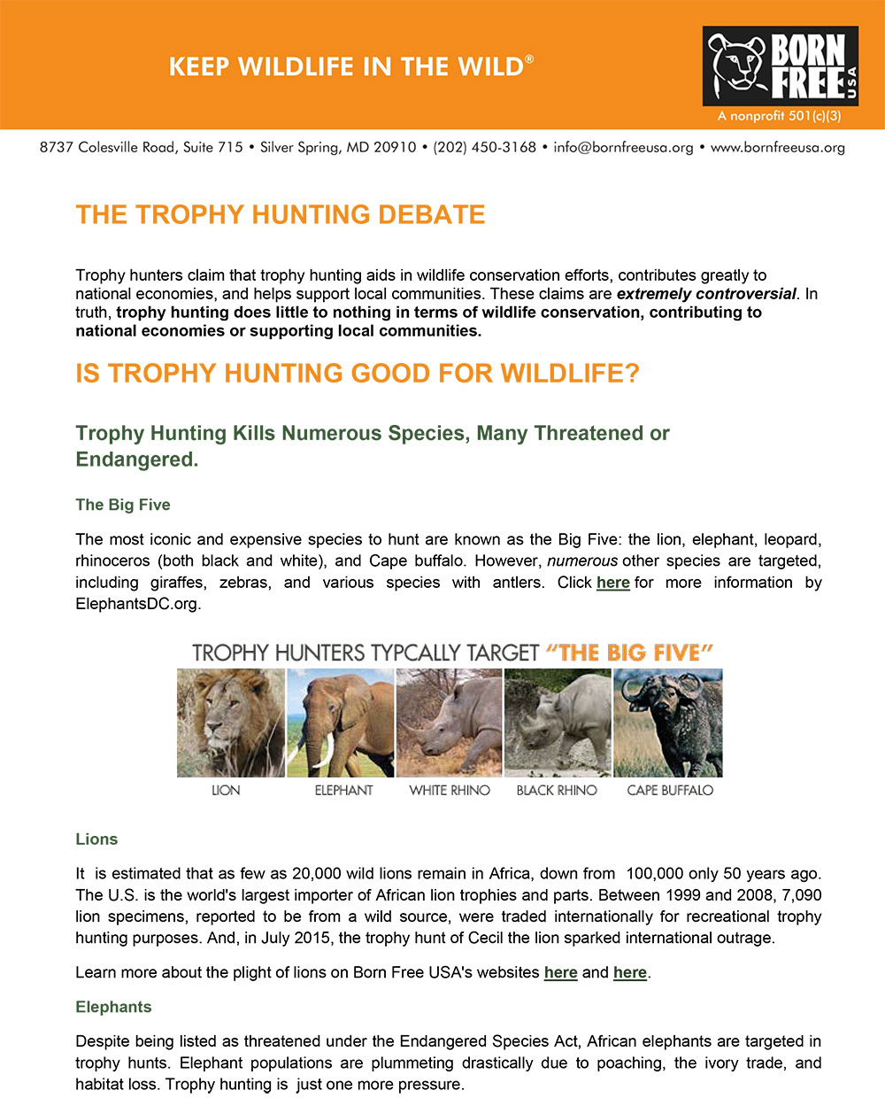 Born Free USA is a global leader in animal welfare and wildlife conservation. Through litigation, legislation, and public education, Born Free USA leads vital campaigns against animals in entertainment, exotic “pets,” trapping and fur, and the destructive international wildlife trade. Born Free USA brings to America the message of “compassionate conservation” — the vision of the U.K.-based Born Free Foundation, established in 1984 by Bill Travers and Virginia McKenna, stars of the iconic film Born Free, along with their son Will Travers. Born Free’s mission is to end suffering of wild animals in captivity, conserve threatened and endangered species, and encourage compassionate conservation globally. More at www.bornfreeusa.org, www.twitter.com/bornfreeusa, and www.facebook.com/bornfreeusa.