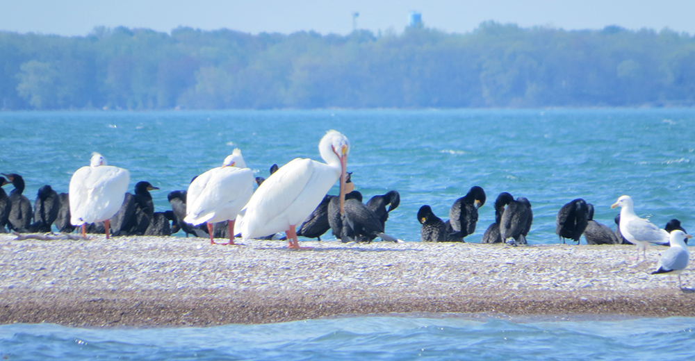 The plan is apparently to reduce cormorant numbers to the point where such plants are protected from them – and leave a remnant cormorant population where it can’t hurt the plants. But, the shooting, plus the visits to the island through the summer to run transects and conduct studies and measure differences, manages to disturb not only surviving cormorants, but other birds. That would include white pelicans, officially a “species-at-risk” in Ontario, that, while not increasing in numbers overall, is in the process of establishing nesting “outposts” in the uninhabited islands of the lower Great Lakes. On the 14th I watched in dismay as a group of 15 pelicans were chased away by Parks Canada’s shooters. The next day, in the absence of any Parks Canada gunmen, my friend, Vicki van Linden, and I documented three pelicans finally able to put down on the island. It is a shame they’re kept from nesting there as it is perfect habitat for them. There are many places where the plant species of concern grow – most places, in fact – but not many where colonial waterbirds can nest.