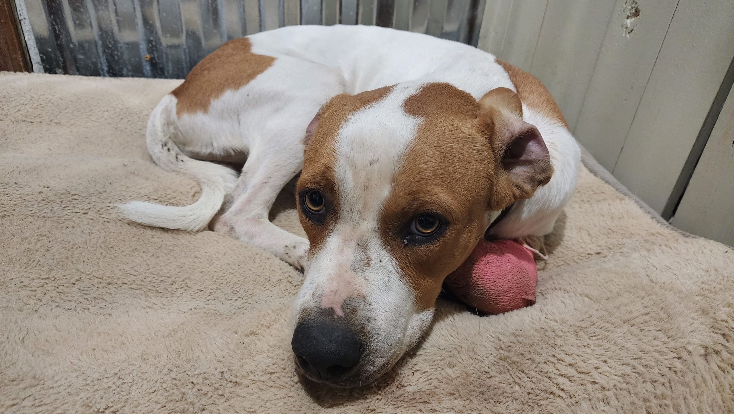 Posie, a labradoodle, was caught in a leghold trap and suffered a massive wound on her leg, which led to a five-hour emergency surgery. Though Posie survived her encounter with a cruel and dangerous leghold trap, she may eventually require amputation.