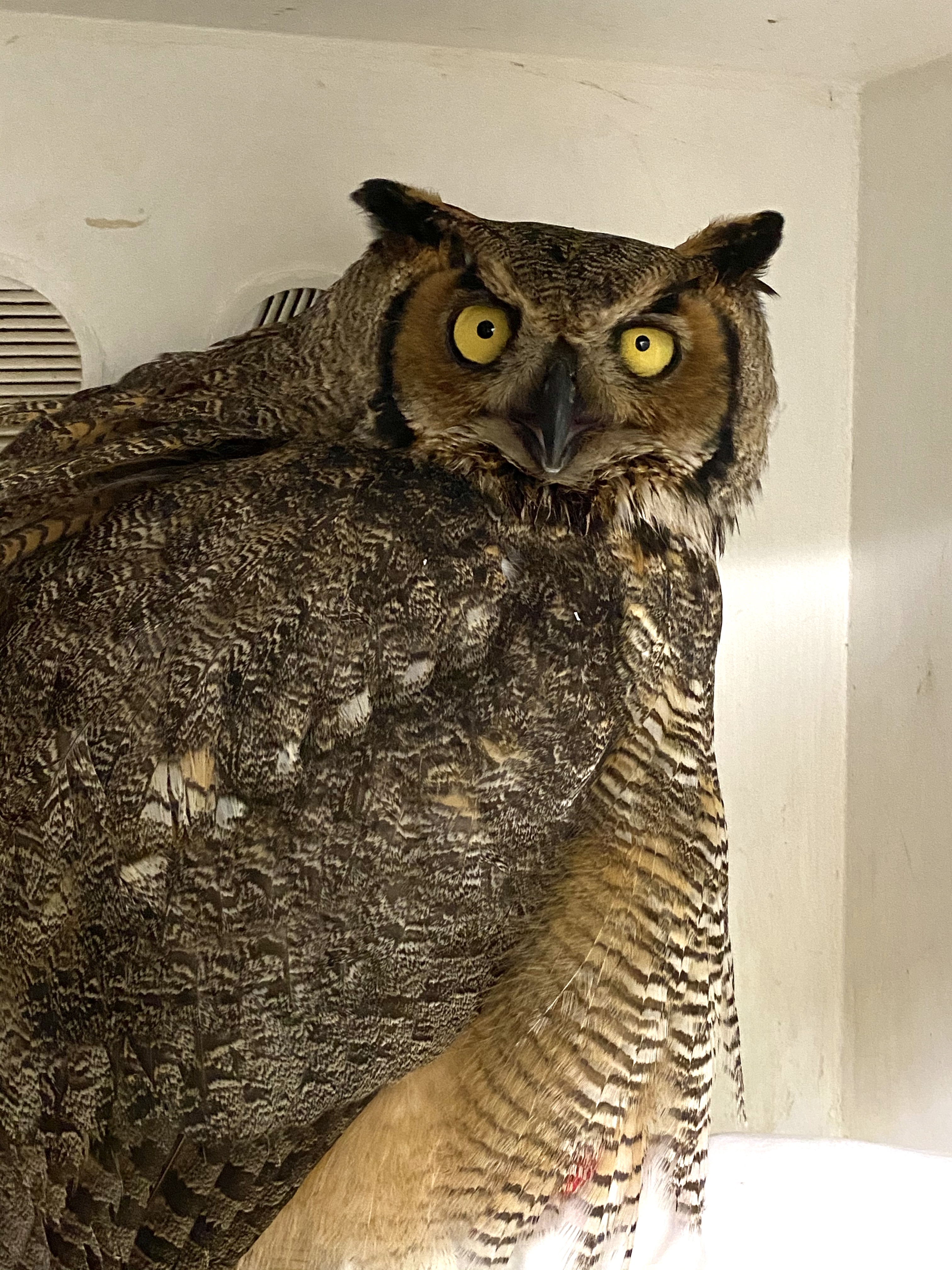 In early 2020, a great horned owl was caught in a leg-hold trap in Massachusetts.